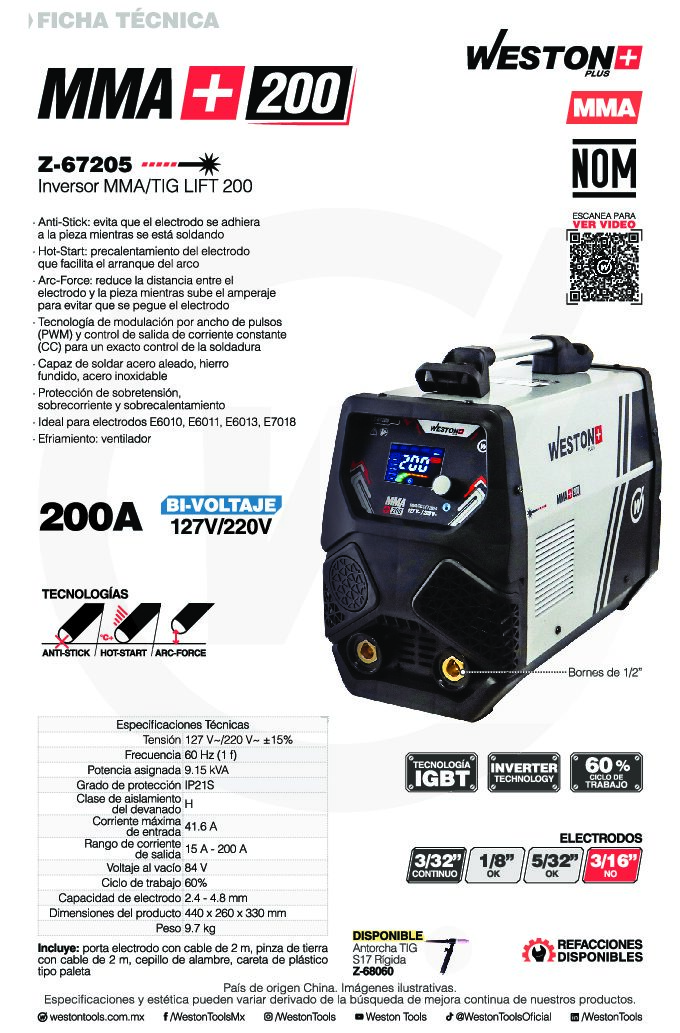 MAQUINA PARA SOLDAR INVERTER ELECTRODO MMA/TIG LIFT 200A 110/220V~1F WESTON PLUS