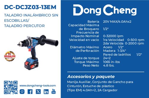 ROTOMARTILLO/ATORNILLADOR INALAMBRICO S/CARBONES 20V 1/2″- 2000RPM/32000IPM – MAX/4.0Ahx2 DONG CHENG